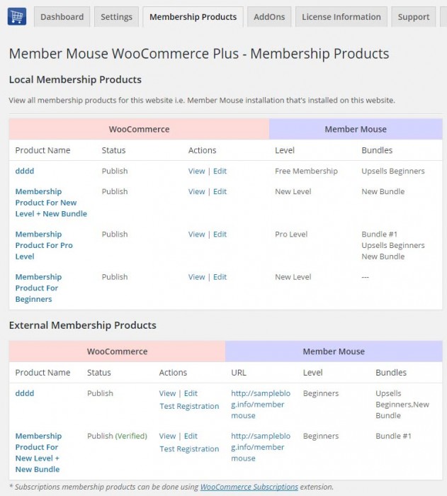 In the membership products settings you will see the complete summary table of the WooCommerce products you have integrated with MemberMouse, including there details: