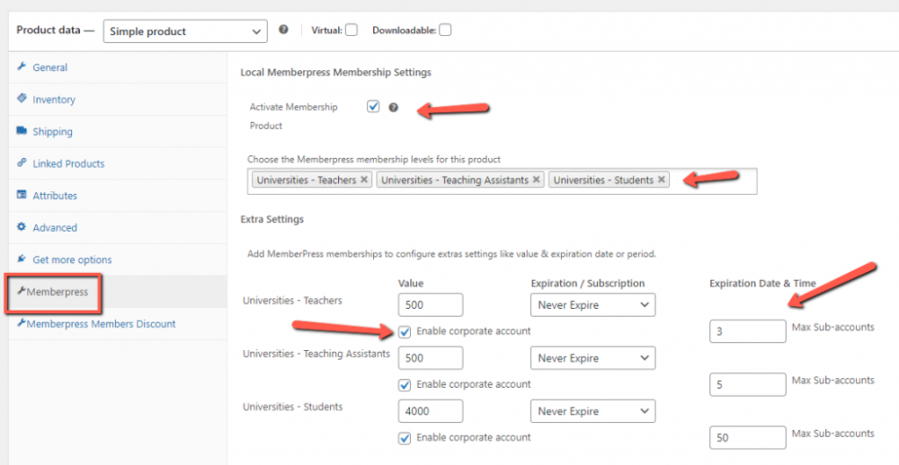 And then go to the Memberpress tab, activate the membership product, choose the relevant memberships and define the extra settings: