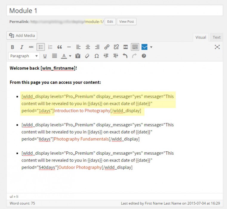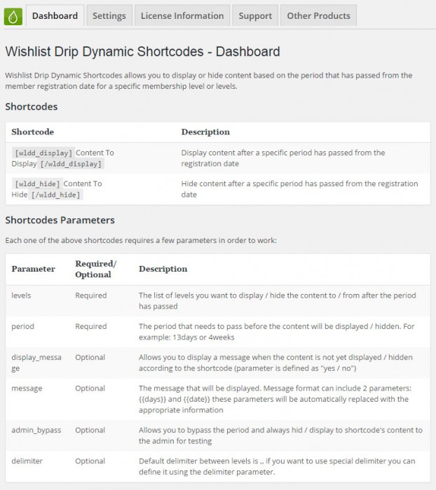 Wishlist Drip Dynamic Shortcodes allows you to display (drip) / hide (archive) content based on the members' registration date, membership level and the time passed since the registration using simple yet powerful shortcodes.