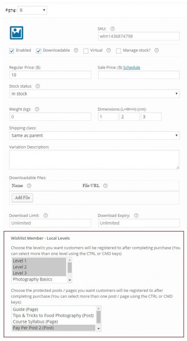 Step #2: Integrate the Membership Level/s and / or Pay-per-post Content - After adding the product variations click on each variation to edit its settings and integrate the relevant membership level/s and / or pay-per-post content as seen in the below screenshot: